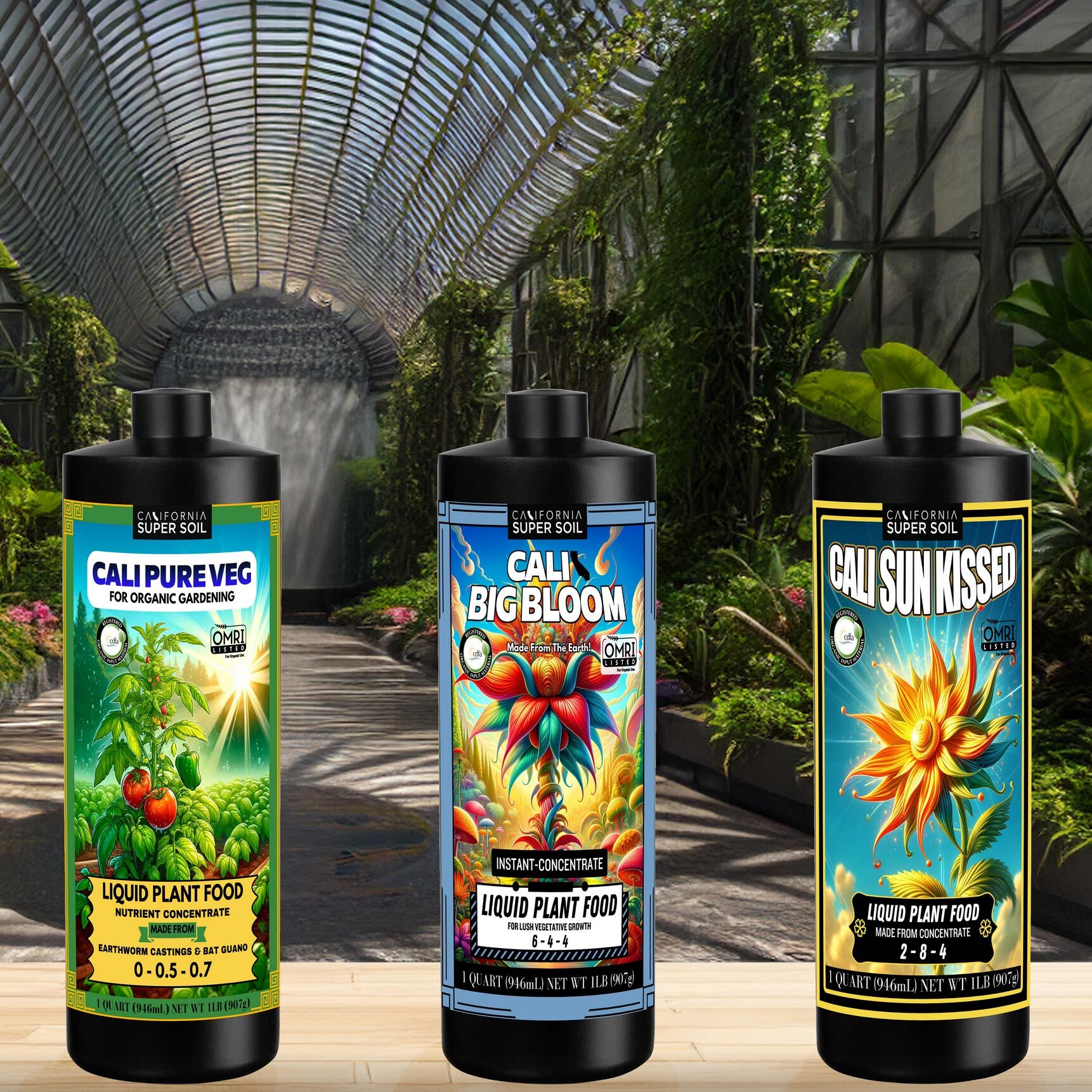Introducing the Cali Super Soil and Hydro Liquid Trio Pack: Your Ultimate Hydroponic and Soil growing Solution.